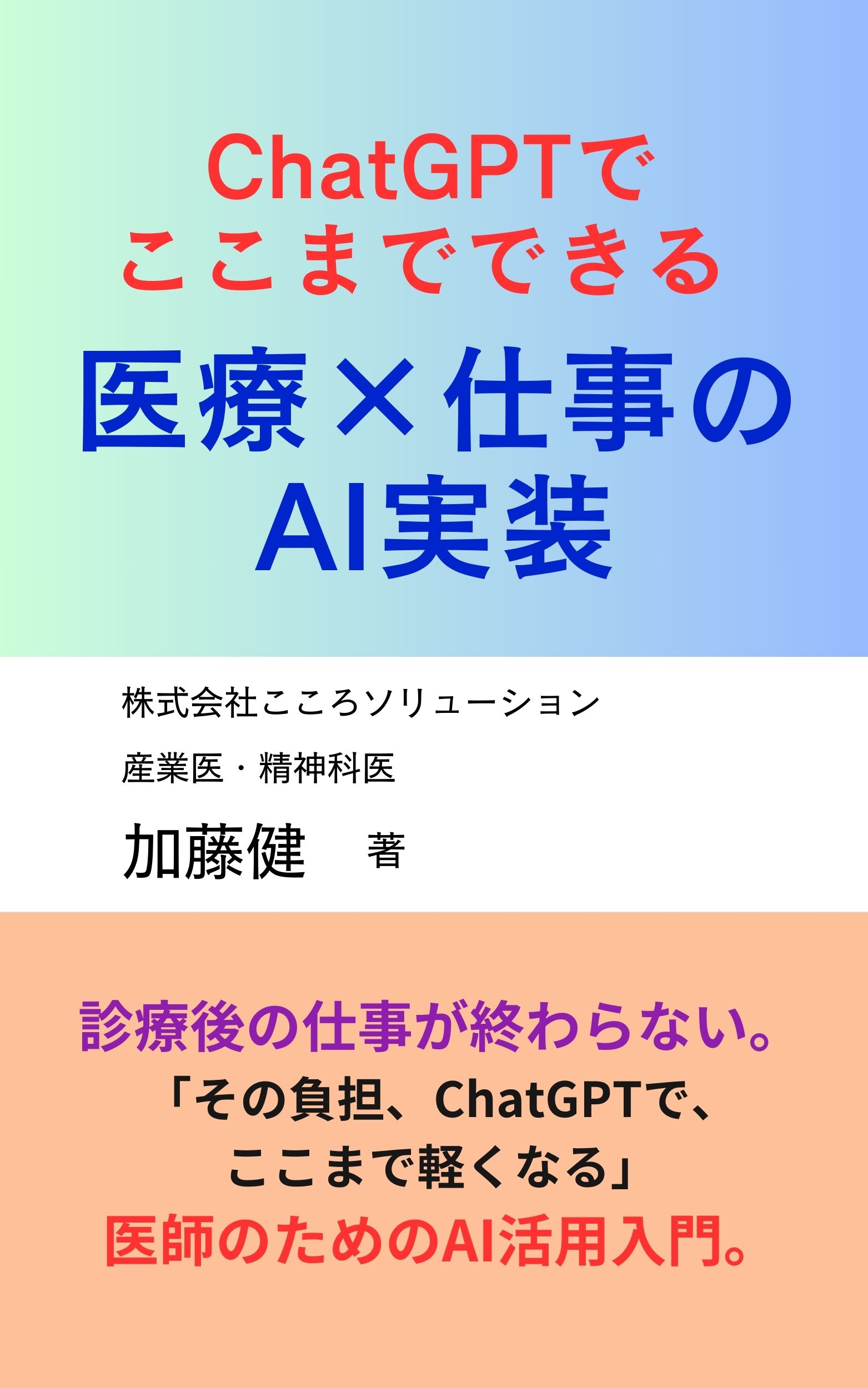 弊社代表取締役の加藤健が「ChatGPTでここまでできる 医療×仕事のAI実装 」を著しました。診療と、診療後の仕事について、ChatGPTを中心にどう整理し、仕組みに変えるか。医師向けの具体的な解説書です。